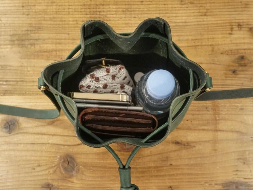 開口部は革紐のタイ(絞り)を滑るように動かすことで開け閉めができ
